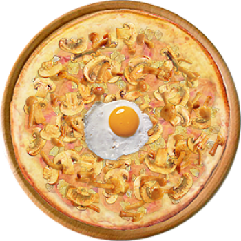 Основа: Итальянская (тонкое тесто ⌀35см) (400 г) Соус: Соус белый (100 г) Топпинги: Балык (50 г), Ветчина (50 г), Курица копченая (50 г), Грибное ассорти (50 г), Сырное ассорти (50 г), Яйцо куриное (50 г) Доп. топпинги: - нет -