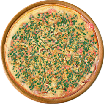 Основа: Итальянская (тонкое тесто ⌀35см) (400 г) Соус: Соус белый (100 г) Топпинги: Бекон (50 г), Копченые колбаски (50 г), Курица копченая (50 г), Шампиньоны (50 г), Сырное ассорти (50 г) Доп. топпинги: Лук зелёный (20 г)