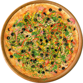 Основа: Традиционная (толстое тесто ⌀35см) (650 г) Соус: Соус красный (100 г) Топпинги: Копченые колбаски (50 г), Курица копченая (50 г), Салями (50 г), Шампиньоны (50 г), Сырное ассорти (50 г), Болгарский перец (50 г), Маслины (50 г) Доп. топпинги: Зелень (10 г)