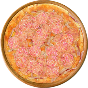 Основа: Традиционная (толстое тесто ⌀35см) (650 г) Соус: Соус красный (100 г) Топпинги: Бекон (50 г), Ветчина (50 г), Салями (50 г), Сыр (50 г) Доп. топпинги: - нет -