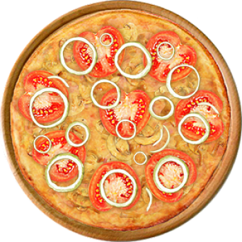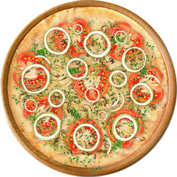 Основа: Итальянская (тонкое тесто ⌀35см) (400 г) Соус: Соус красный (100 г) Топпинги: Ветчина (50 г), Грибное ассорти (50 г), Сыр (50 г), Сырное ассорти (50 г), Помидоры (50 г) Доп. топпинги: Лук репчатый (35 г)