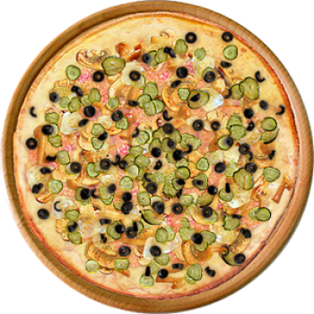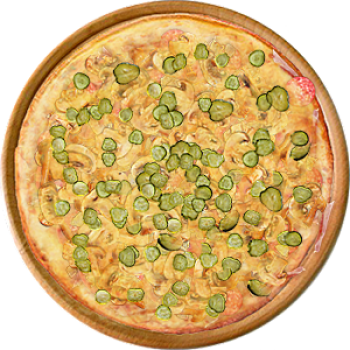 Основа: Итальянская (тонкое тесто ⌀35см) (400 г) Соус: Соус белый (100 г) Топпинги: Бекон (50 г), Ветчина (50 г), Копченые колбаски (50 г), Курица копченая (50 г), Грибное ассорти (50 г), Шампиньоны (50 г), Сыр (50 г), Сырное ассорти (50 г), Огурчики (50 г) Доп. топпинги: - нет -