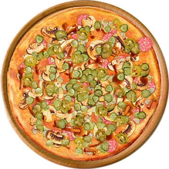 Основа: Итальянская (тонкое тесто ⌀35см) (400 г) Соус: Соус красный (100 г) Топпинги: Копченые колбаски (50 г), Курица копченая (50 г), Грибное ассорти (50 г), Халапеньо (50 г), Огурчики (100 г) Доп. топпинги: - нет -