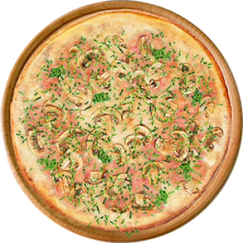 Основа: Итальянская (тонкое тесто ⌀35см) (400 г) Соус: Соус белый (100 г) Топпинги: Ветчина (50 г), Шампиньоны (50 г), Сыр (50 г) Доп. топпинги: Зелень (10 г)