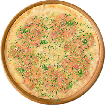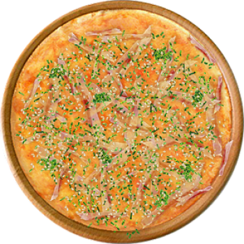Основа: Традиционная (толстое тесто ⌀35см) (650 г) Соус: Соус белый (100 г) Топпинги: Ветчина (50 г), Сырное ассорти (50 г) Доп. топпинги: Зелень (10 г), Кунжут (10 г)