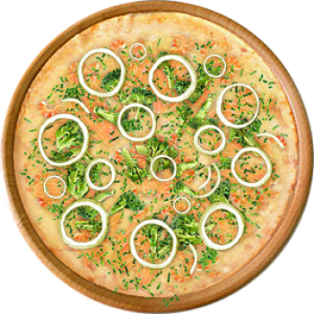 Основа: Традиционная (толстое тесто ⌀35см) (650 г) Соус: Соус белый (100 г) Топпинги: Брокколи (50 г), Креветки (100 г), Лосось (100 г), Сырное ассорти (100 г) Доп. топпинги: Зелень (10 г), Лук репчатый (35 г)