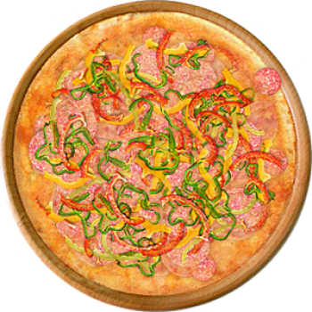 Основа: Традиционная (толстое тесто ⌀35см) (650 г) Соус: Соус красный (100 г) Топпинги: Балык (50 г), Ветчина (50 г), Копченые колбаски (50 г), Салями (50 г), Сыр (50 г), Болгарский перец (50 г) Доп. топпинги: - нет -