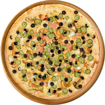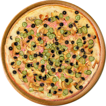 Основа: Традиционная (толстое тесто ⌀35см) (650 г) Соус: Соус белый (100 г) Топпинги: Балык (50 г), Грибное ассорти (50 г), Сыр Филадельфия (50 г), Сырное ассорти (50 г), Огурчики (50 г), Маслины (50 г) Доп. топпинги: - нет -