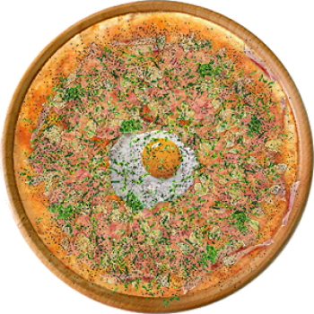 Основа: Традиционная (толстое тесто ⌀35см) (650 г) Соус: Соус красный (100 г) Топпинги: Бекон (50 г), Ветчина (50 г), Курица копченая (50 г), Сыр (100 г), Яйцо куриное (100 г) Доп. топпинги: Зелень (10 г), Чёрный перец (10 г)