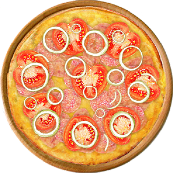 Основа: Итальянская (тонкое тесто ⌀35см) (400 г) Соус: Соус сырный (100 г) Топпинги: Ветчина (50 г), Салями (50 г), Сыр (50 г), Помидоры (50 г) Доп. топпинги: Лук репчатый (35 г)