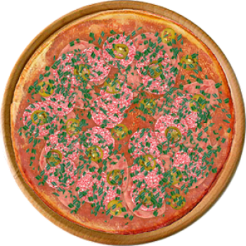 Основа: Итальянская (тонкое тесто ⌀35см) (400 г) Соус: Соус красный (100 г) Топпинги: Грибное ассорти (50 г), Сырное ассорти (50 г), Огурчики (50 г), Помидоры (50 г), Ветчина (100 г) Доп. топпинги: Зелень (10 г), Лук репчатый (35 г)