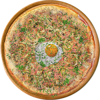 Основа: Итальянская (тонкое тесто ⌀35см) (400 г) Соус: Соус белый (100 г) Топпинги: Бекон (100 г), Ветчина (100 г), Шампиньоны (100 г), Сыр (100 г), Яйцо куриное (100 г) Доп. топпинги: Зелень (10 г), Чёрный перец (10 г)