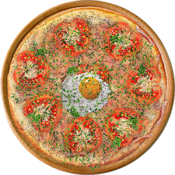 Основа: Итальянская (тонкое тесто ⌀35см) (400 г) Соус: Соус белый (100 г) Топпинги: Помидоры (50 г), Бекон (100 г), Ветчина (100 г), Сыр (100 г), Яйцо куриное (100 г) Доп. топпинги: Зелень (10 г), Чёрный перец (10 г)