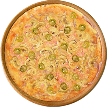 Основа: Традиционная (толстое тесто ⌀35см) (650 г) Соус: Соус красный (100 г) Топпинги: Балык (50 г), Бекон (50 г), Салями (50 г), Шампиньоны (50 г), Сыр (50 г), Сырное ассорти (50 г), Халапеньо (50 г) Доп. топпинги: - нет -