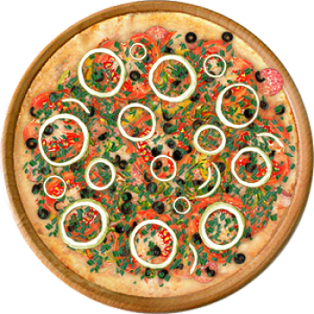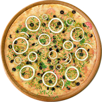 Основа: Традиционная (толстое тесто ⌀35см) (650 г) Соус: Соус белый (100 г) Топпинги: Ветчина (50 г), Грудинка (50 г), Копченые колбаски (50 г), Сыр (50 г), Болгарский перец (50 г), Помидоры (50 г), Маслины (50 г) Доп. топпинги: Лук зелёный (20 г), Лук репчатый (35 г)