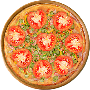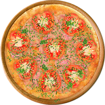 Основа: Традиционная (толстое тесто ⌀35см) (650 г) Соус: Соус красный (100 г) Топпинги: Ветчина (50 г), Салями (50 г), Сыр (50 г), Помидоры (50 г) Доп. топпинги: Зелень (10 г)