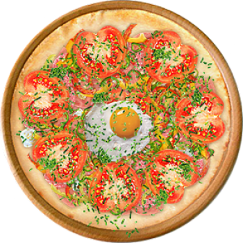 Основа: Традиционная (толстое тесто ⌀35см) (650 г) Соус: Соус красный (100 г) Топпинги: Бекон (50 г), Ветчина (50 г), Салями (50 г), Сыр Филадельфия (50 г), Болгарский перец (50 г), Помидоры (50 г), Яйцо куриное (50 г) Доп. топпинги: Зелень (10 г)