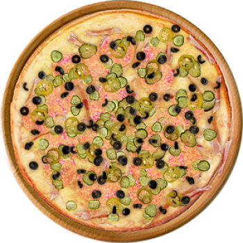 Основа: Итальянская (тонкое тесто ⌀35см) (400 г) Соус: Соус белый (100 г) Топпинги: Бекон (50 г), Салями (50 г), Сырное ассорти (50 г), Огурчики (50 г), Халапеньо (50 г), Маслины (50 г) Доп. топпинги: - нет -