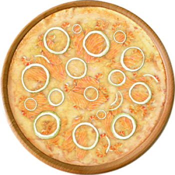 Основа: Традиционная (толстое тесто ⌀35см) (650 г) Соус: Соус белый (100 г) Топпинги: Креветки (50 г), Лосось (50 г), Сырное ассорти (100 г) Доп. топпинги: Лук репчатый (35 г)