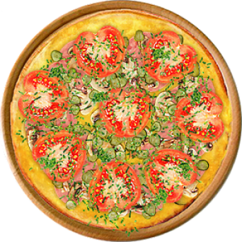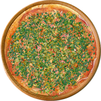 Основа: Итальянская (тонкое тесто ⌀35см) (400 г) Соус: Соус сырный (100 г) Топпинги: Ветчина (50 г), Шампиньоны (50 г), Огурчики (50 г), Помидоры (50 г) Доп. топпинги: Зелень (10 г)