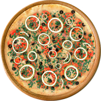 Основа: Традиционная (толстое тесто ⌀35см) (650 г) Соус: Соус белый (100 г) Топпинги: Ветчина (50 г), Курица копченая (50 г), Сыр (50 г), Помидоры (50 г), Маслины (50 г) Доп. топпинги: Лук зелёный (20 г), Лук репчатый (35 г)