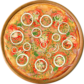 Основа: Итальянская (тонкое тесто ⌀35см) (400 г) Соус: Соус красный (100 г) Топпинги: Бекон (50 г), Ветчина (50 г), Сырное ассорти (50 г), Помидоры (50 г) Доп. топпинги: Зелень (10 г), Лук репчатый (35 г)