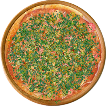 Основа: Традиционная (толстое тесто ⌀35см) (650 г) Соус: Соус чили (100 г) Топпинги: Бекон (50 г), Салями (50 г), Грибное ассорти (50 г), Сыр (50 г), Огурчики (50 г), Халапеньо (50 г), Ветчина (100 г) Доп. топпинги: Зелень (10 г), Лук зелёный (20 г)