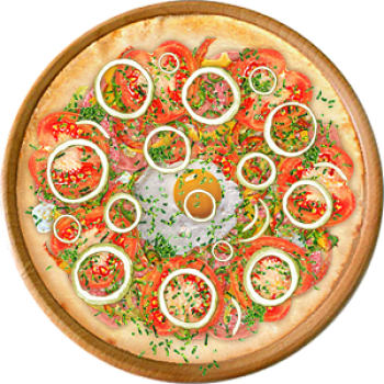 Основа: Традиционная (толстое тесто ⌀35см) (650 г) Соус: Соус белый (100 г) Топпинги: Балык (50 г), Ветчина (50 г), Салями (50 г), Сыр Филадельфия (50 г), Болгарский перец (50 г), Помидоры (50 г), Яйцо куриное (50 г) Доп. топпинги: Зелень (10 г), Лук репчатый (35 г)