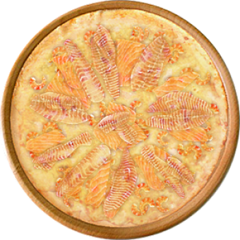 Основа: Традиционная (толстое тесто ⌀35см) (650 г) Соус: Соус белый (100 г) Топпинги: Креветки (50 г), Лосось (50 г), Окунь (филе) (50 г), Сырное ассорти (50 г) Доп. топпинги: - нет -