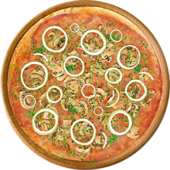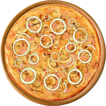 Основа: Итальянская (тонкое тесто ⌀35см) (400 г) Соус: Соус красный (100 г) Топпинги: Ветчина (50 г), Грибное ассорти (50 г), Сырное ассорти (50 г) Доп. топпинги: Лук репчатый (35 г)