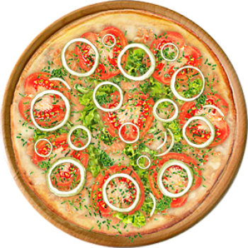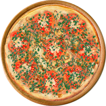 Основа: Итальянская (тонкое тесто ⌀35см) (400 г) Соус: Соус белый (100 г) Топпинги: Ветчина (50 г), Грибное ассорти (50 г), Помидоры (50 г), Сыр (100 г) Доп. топпинги: Лук зелёный (20 г)