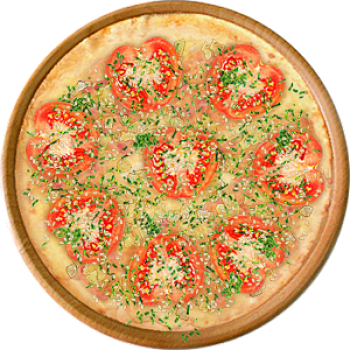 Основа: Традиционная (толстое тесто ⌀35см) (650 г) Соус: Соус белый (100 г) Топпинги: Ветчина (50 г), Курица копченая (50 г), Сырное ассорти (50 г), Помидоры (50 г) Доп. топпинги: Зелень (10 г), Кунжут (10 г)