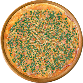 Основа: Традиционная (толстое тесто ⌀35см) (650 г) Соус: Соус красный (100 г) Топпинги: Бекон (50 г), Ветчина (50 г), Курица копченая (50 г), Сырное ассорти (150 г), Картофель фри (150 г) Доп. топпинги: Кунжут (10 г), Лук зелёный (20 г)