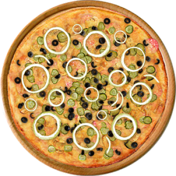 Основа: Итальянская (тонкое тесто ⌀35см) (400 г) Соус: Соус красный (100 г) Топпинги: Ветчина (50 г), Копченые колбаски (50 г), Салями (50 г), Грибное ассорти (50 г), Сыр (50 г), Сырное ассорти (50 г), Огурчики (50 г), Маслины (50 г) Доп. топпинги: Лук репчатый (35 г)