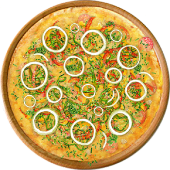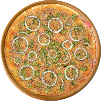 Основа: Традиционная (толстое тесто ⌀35см) (650 г) Соус: Соус красный (100 г) Топпинги: Бекон (50 г), Ветчина (50 г), Копченые колбаски (50 г), Сыр (50 г), Сырное ассорти (50 г), Огурчики (50 г) Доп. топпинги: Лук репчатый (35 г), Чёрный перец (10 г)