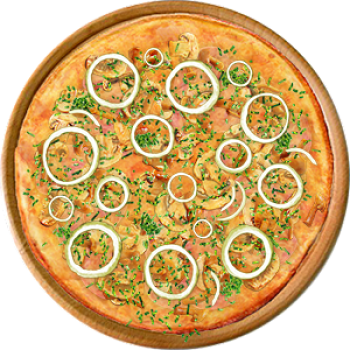 Основа: Итальянская (тонкое тесто ⌀35см) (400 г) Соус: Соус красный (100 г) Топпинги: Ветчина (50 г), Грибное ассорти (50 г), Сырное ассорти (50 г) Доп. топпинги: Зелень (10 г), Лук репчатый (35 г)