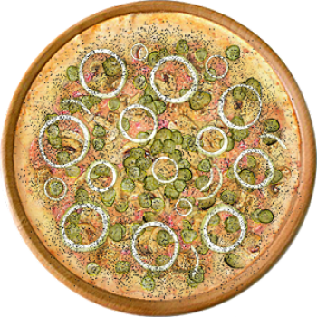 Основа: Традиционная (толстое тесто ⌀35см) (650 г) Соус: Соус белый (100 г) Топпинги: Салями (50 г), Шампиньоны (50 г), Сырное ассорти (50 г), Огурчики (50 г), Ветчина (100 г) Доп. топпинги: Лук репчатый (35 г), Чёрный перец (10 г)