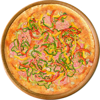 Основа: Традиционная (толстое тесто ⌀35см) (650 г) Соус: Соус красный (100 г) Топпинги: Грудинка (50 г), Курица копченая (50 г), Салями (50 г), Сыр (50 г), Болгарский перец (50 г) Доп. топпинги: - нет -