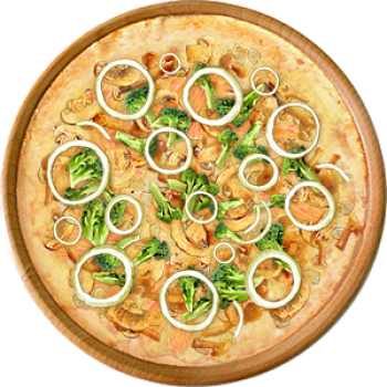 Основа: Традиционная (толстое тесто ⌀35см) (650 г) Соус: Соус белый (100 г) Топпинги: Курица копченая (50 г), Лосось (50 г), Грибное ассорти (50 г), Сырное ассорти (50 г), Брокколи (50 г) Доп. топпинги: Лук репчатый (35 г)