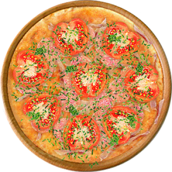 Основа: Традиционная (толстое тесто ⌀35см) (650 г) Соус: Соус красный (100 г) Топпинги: Бекон (50 г), Салями (50 г), Сыр (50 г), Помидоры (50 г) Доп. топпинги: Зелень (10 г)