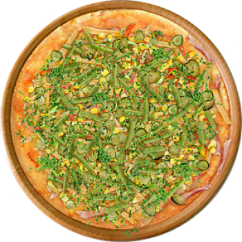 Основа: Традиционная (толстое тесто ⌀35см) (650 г) Соус: Соус красный (100 г) Топпинги: Ветчина (50 г), Курица копченая (50 г), Сырное ассорти (50 г), Болгарский перец (50 г), Брокколи (50 г), Кукуруза (50 г), Огурчики (50 г), Фасоль стручковая (50 г), Бекон (100 г), Картофель фри (100 г) Доп. топпинги: Зелень (10 г)