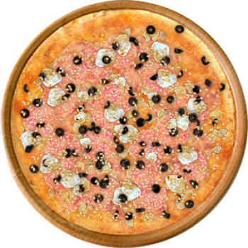 Основа: Традиционная (толстое тесто ⌀35см) (650 г) Соус: Соус красный (100 г) Топпинги: Ветчина (50 г), Курица копченая (50 г), Салями (50 г), Сыр Филадельфия (50 г), Маслины (50 г), Сыр (100 г) Доп. топпинги: Кунжут (10 г)