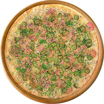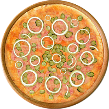 Основа: Традиционная (толстое тесто ⌀35см) (650 г) Соус: Соус красный (100 г) Топпинги: Ветчина (50 г), Сыр (50 г), Огурчики (50 г) Доп. топпинги: Лук репчатый (35 г)