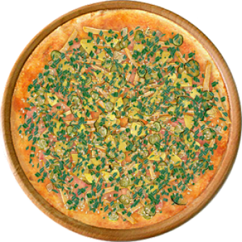 Основа: Традиционная (толстое тесто ⌀35см) (650 г) Соус: Соус красный (100 г) Топпинги: Ветчина (50 г), Грудинка (50 г), Курица копченая (50 г), Грибное ассорти (50 г), Сырное ассорти (50 г), Болгарский перец (50 г), Кукуруза (50 г), Помидоры (50 г) Доп. топпинги: Зелень (10 г), Лук репчатый (35 г)
