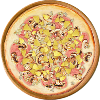 Основа: Итальянская (тонкое тесто ⌀35см) (400 г) Соус: Соус белый (100 г) Топпинги: Ветчина (50 г), Курица копченая (50 г), Шампиньоны (50 г), Ананасы (100 г) Доп. топпинги: - нет -