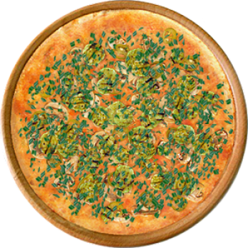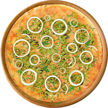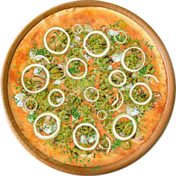 Основа: Традиционная (толстое тесто ⌀35см) (650 г) Соус: Соус красный (100 г) Топпинги: Шампиньоны (50 г), Сыр (50 г), Сырное ассорти (50 г), Халапеньо (50 г), Цукини (50 г) Доп. топпинги: Зелень (10 г), Лук репчатый (35 г)