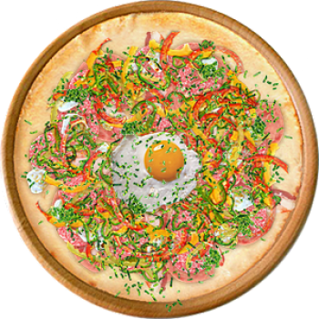 Основа: Традиционная (толстое тесто ⌀35см) (650 г) Соус: Соус белый (100 г) Топпинги: Ветчина (50 г), Грудинка (50 г), Салями (50 г), Сыр Филадельфия (50 г), Болгарский перец (50 г), Яйцо куриное (50 г) Доп. топпинги: Зелень (10 г)