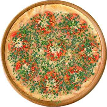 Основа: Традиционная (толстое тесто ⌀35см) (650 г) Соус: Соус белый (100 г) Топпинги: Ветчина (50 г), Курица копченая (50 г), Помидоры (50 г), Сыр (100 г) Доп. топпинги: Зелень (10 г), Лук зелёный (20 г)