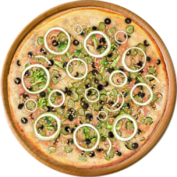 Основа: Итальянская (тонкое тесто ⌀35см) (400 г) Соус: Соус белый (100 г) Топпинги: Шампиньоны (50 г), Сыр (50 г), Брокколи (50 г), Огурчики (50 г), Маслины (50 г), Ветчина (100 г) Доп. топпинги: Кунжут (10 г), Лук репчатый (35 г)
