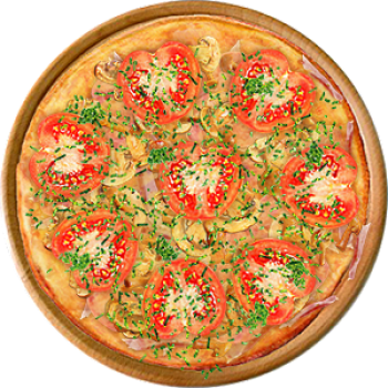 Основа: Итальянская (тонкое тесто ⌀35см) (400 г) Соус: Соус красный (100 г) Топпинги: Бекон (50 г), Ветчина (50 г), Грибное ассорти (50 г), Сырное ассорти (50 г), Помидоры (50 г) Доп. топпинги: Зелень (10 г)